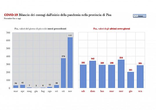 La provincia di Pisa, con 2.983 casi ogni 100mila abitanti, è la seconda in Toscana per numerosità di contagi in rapporto alla popolazione (prima Prato, terza Massa Carrara, ultima Grosseto). La media toscana è di 2.437, quella italiana di circa 2.168.
