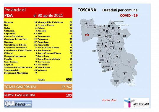 Con i dati di oggi la Regione aggiorna a 27.762 il totale dei casi di coronavirus rilevati a Pisa e provincia dall'inizio epidemia, mentre il bilancio delle vittime sale a 653.