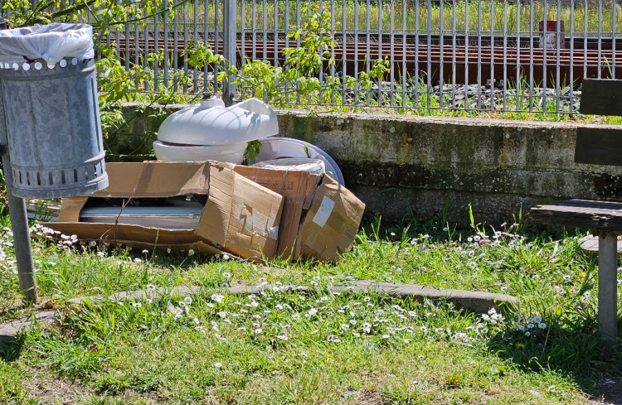 Tra le panchine di viale della Repubblica, lungo i binari della ferrovia, spuntano di nuovo dei rifiuti abbandonati. Tra i quali anche un water