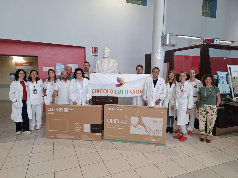 La consegna dei due televisori si è svolta nell’atrio del "Lotti" alla presenza del direttore dell’ospedale Luca Nardi, della primaria del trasfusionale, Danila Pappalardo, della coordinatrice infermieristica Barbara Ferretti e, ovviamente, del consiglio del Circolo Lotti Valdera.