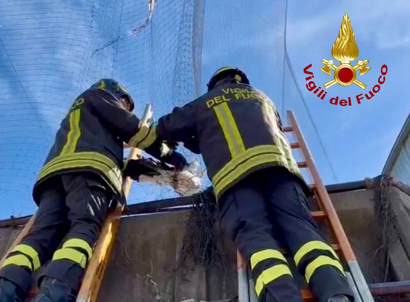 Il volatile era rimasto incastrato un una rete perimetrale in viale America: è stato salvato dall'intervento del personale dei Vigili del fuoco