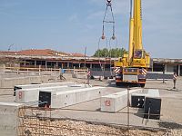 Le strutture prefabbricate sono giunte a destinazione, ma per issarle serve un mezzo d'opera potente. La nuova piscina coperta presto prenderà forma