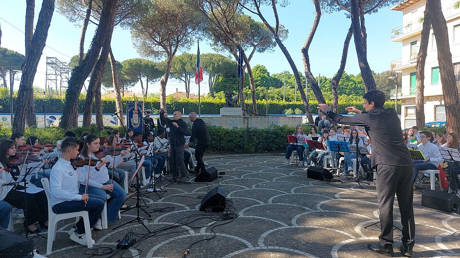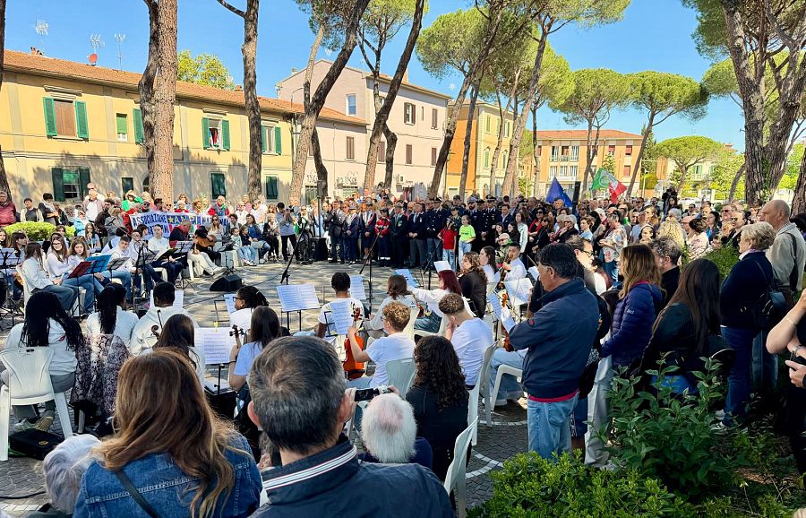 Oltre al sindaco Matteo Franconi, ad Alberto Tardini, presidente provinciale di Anpi, e a Massimo Fornaciari, vicepresidente di Aned, in piazza c'erano infatti anche i ragazzi e le ragazze dell'orchestra costituita nei mesi scorsi e che mette insieme gli istituti "Curtatone e Montanara", "Gandhi" e "Pacinotti". Dall'inno nazionale all'Inno alla gioia, fino a Bella ciao, il repertorio della giovane orchestra è stata guidata da Alessandro Volpi, Nicola Campanile e Sara Galanti.