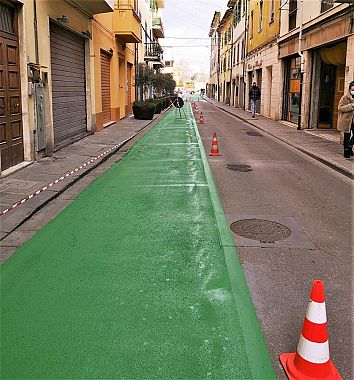 Nei due tratti, ora ricolorati di verde prima c'erano diversi parcheggi con gli stalli blu. Ultimamente erano stati tolti i parcheggi e sostituiti con delle piante. Ora il Comune sta provvedendo all'intervento definitivo.